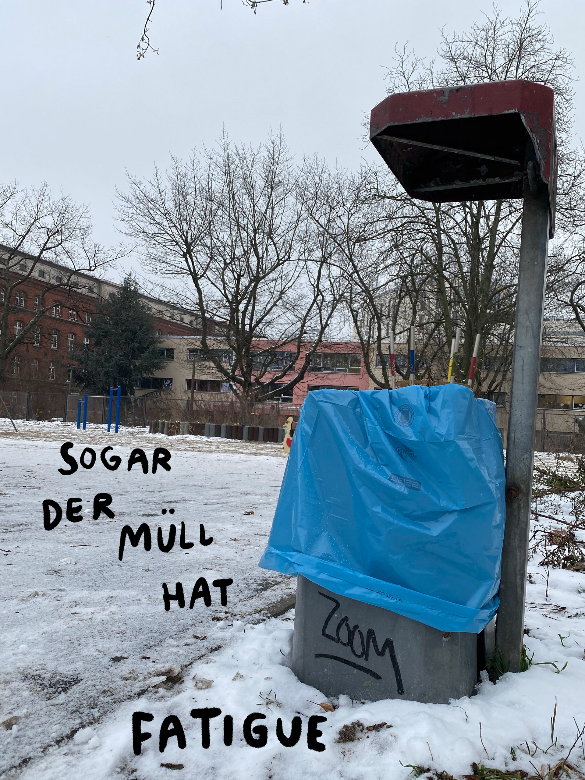 Die aufgeschriebenen Gedanken verleihen den alltäglichen Bildern neue Assoziationen. Eine leere Litfaßsäule fungiert als Terminkalender. Aus verschollenen DHL Paketen entstehen Brieffreundschaften zwischen Nachbarn. Die unterschiedlichen Erzählstränge kehren in wörtlichen und visuellen Callbacks wieder. Der Entstehungsprozess der Fotos ist die fertige Arbeit. Die Monotonie, die viele während Corona erlebten, kann albern sein. Und wir können in der albernen Monotonie trotzdem weiter wirksam sein. Trotz der Wiederholbarkeit jeden Momentes können wir den Moment ergreifen. In diesen Fotos kann Corona uns Freiheit, Lust, Spaß, Spontanität nicht nehmen.